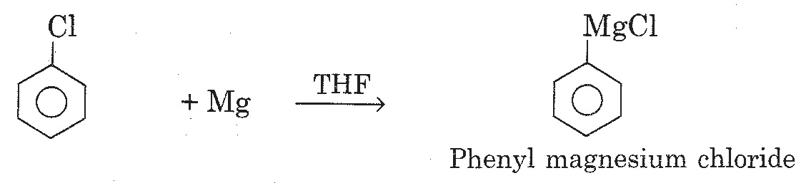 Chlorobenzene reacts with Mg in presence of tetrahydrofuran (THF) solvent, to give phenyl magnesium chloride.