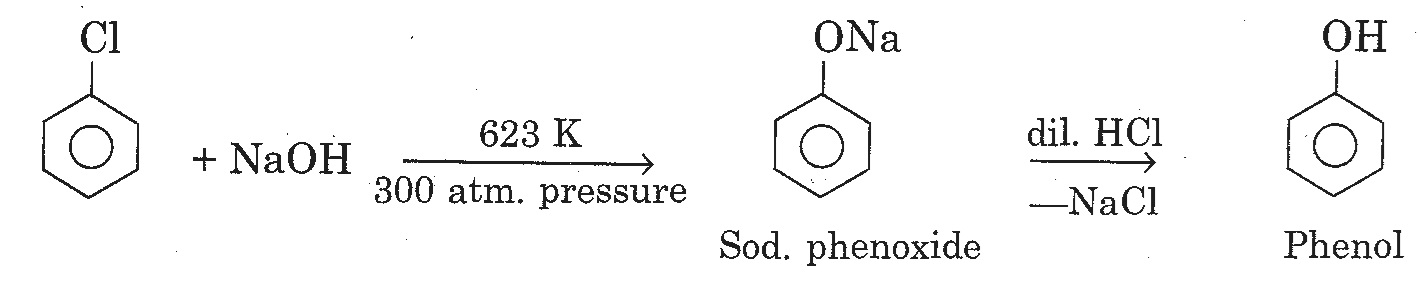 i) Reaction with NaOH: – When aryl halide is heated with aqueous solution of NaOH at 623 K under pressure (about 300 atm), the halogen atom is replaced by hydroxyl group forming phenol.