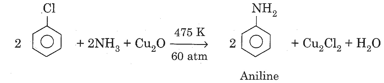 ii) Reaction with Ammonia: – Chlorobenzene on heating with aqueous solution of ammonia in the presence of cuprous oxide as a catalyst at 475 K and under pressure of 60 atmospheres, the halogen atom is replaced by amino group giving aniline.