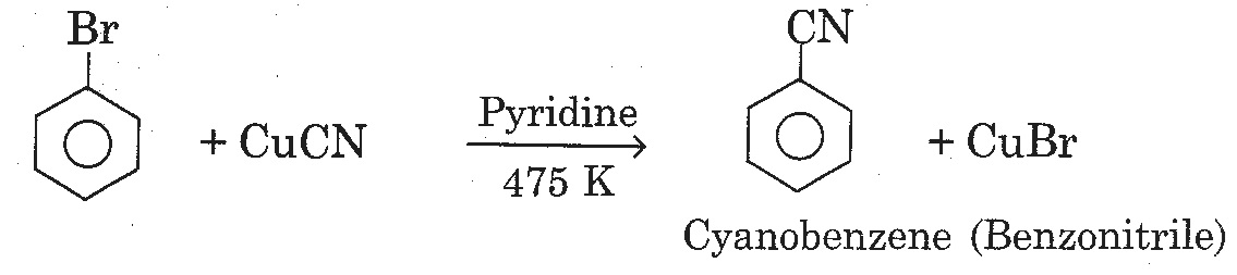 iii) Reaction with CuCN: – Chlorobenzene on heating with anhydrous cuprous cyanide in the presence of pyridine or DMF (dimethylformamide), the halogen atom is replaced by cyano group giving cyanobenzene (Benzonitile).