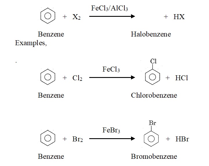 1) Direct Halogenation: – Aryl chloride and aryl bromides are generally prepared by direct chlorination or bromination of benzene. These reactions are carried out in dark, at ordinary temperature in the presence FeCl3, FeBr3 or AlCl3.