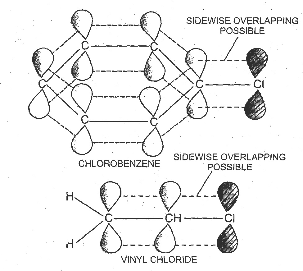 It is evident that the contribution of structures III, IV and V imparts a partial double bond character to the carbon-chlorine bond. This is confirmed by X-ray analysis which shows that the C—Cl bond length in chlorobenzene is 169 pm while the C—Cl bond length in ethyl chloride molecule is 182 pm. The shortening of bond length imparts stability to aryl halides and as a result, the bond cleavage becomes rather difficult. The aryl halides are, therefore, less reactive than alkyl halides.