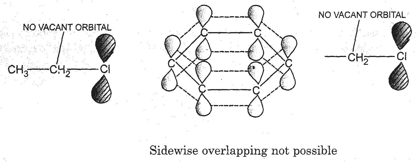 However, there is no possibility of double bond character in C—X bond in alkyl halides. In benzyl halides also, there is a —CH2— group separating the halogen atom from a sp2 hybridised carbon. Therefore, the filled p-orbital of halogen atom (e.g. Cl) cannot overlap sidewise with the unhybridised p-orbital of C-atom. Therefore, the C—Cl bond is not very strong and can be easily cleaved. Thus, both alkyl halides and benzyl halides are more reactive than vinyl and aryl halides.