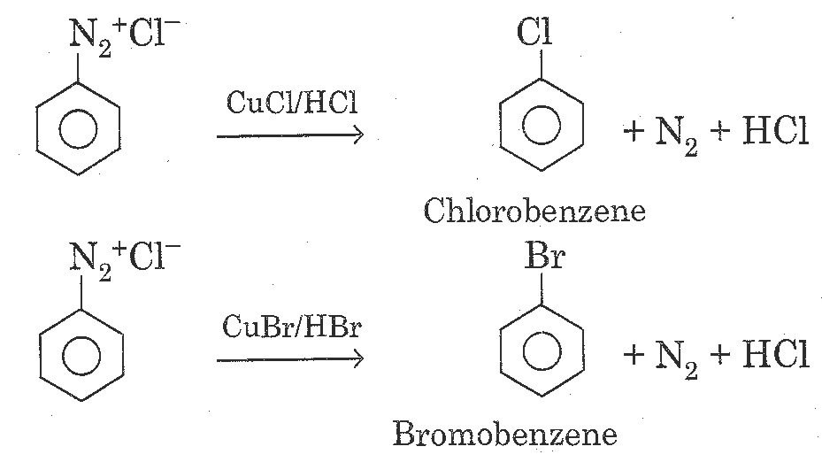 2) From Diazonium salts: – Chloro and bromobenzene are prepared by treating a freshly prepared diazonium salt solution with cuprous chloride or cuprous bromide dissolved in corresponding halogen acids.