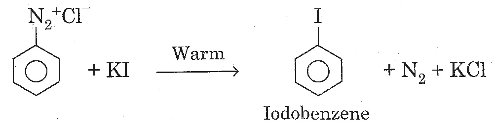Iodobenzene is prepared by warming the diazonium salt solution with aqueous KI solution.