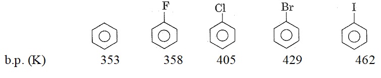Haloarenes are generally colourless crystalline solids or liquids. They are heavier than water and insoluble in it but soluble in organic solvents. The m.p and b.p. of haloarenes are nearly the same as those of alkyl halides containing the same number of carbon atoms. The b.p. of monohalogen derivatives of benzene are in the order: