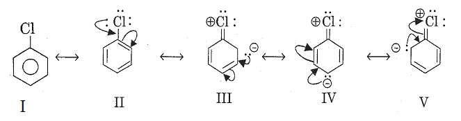 (1) Resonance Effect: – In haloarenes, there is delocalization of electrons due to resonance. For examples, chlorobenzene is considered to be a resonance hybrid of the following structures: