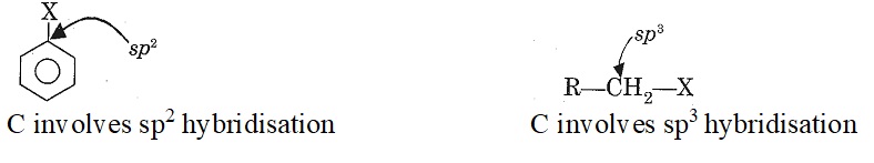 Different hybridisation states of carbon atom: – In haloalkanes, the carbon atom of the C—X bond is sp3 hybridised while in haloarenes, the carbon atom is sp2 hybridised. The sp2 hybridised carbon atom with a greater s- character is more electronegative. It can hold the electron pair of the bond more tightly than the sp3 hybridised carbon atom in alkyl halides. Therefore, it has less tendency to release electrons to the halogen. As a result, the bond cleavage in aryl halides is somewhat more difficult than in alkyl halides.