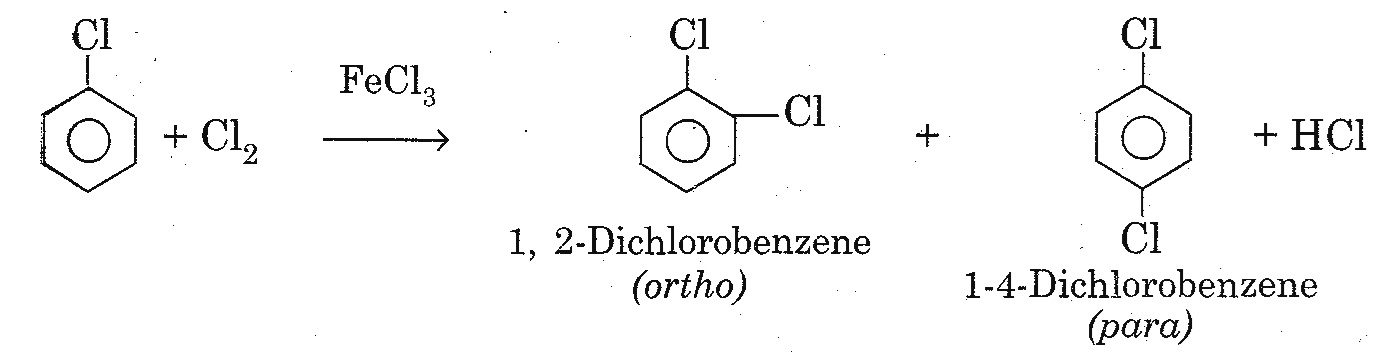 1) Halogenation: – When chlorobenzene is treated with chlorine in presence of ferric salt as catalyst, it gives ortho & para dichlorobenzene.