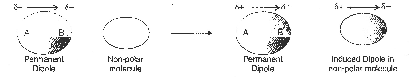 This type of attractive forces operates between polar molecules having µ>0 and the non polar molecules having µ = 0. Permanent dipole of the polar molecule induces dipole on the electrically neutral molecule by deforming its electron cloud. Induced dipole moment depends upon the dipole moment of the permanent dipole and the polarizability of the electrically neutral molecule. Molecules of larger size can be easily polarized. Higher polarizability increases the strength of attractive interactions.