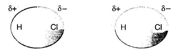 Dipole-dipole forces operate between the molecules possessing permanent dipole. Ends of the dipole possess “partial charges” and these charges are shown by Greek letter delta (δ). Partial charges are always less than the unit charge (1.6 x 10-19 C) because of electron sharing effect. The polar molecules interact with neighbouring molecules. This interaction is weak as compared to ion-ion interaction because only partial charges are involved. The interaction energy decreases with the increase of distance between the dipoles. Besides dipole-dipole interaction, polar molecules can interact by London forces. The cumulative effect of both the interactions is the total increase of intermolecular forces in polar molecules. The electron cloud distribution and attractive interactions between H—Cl dipoles are shown below.