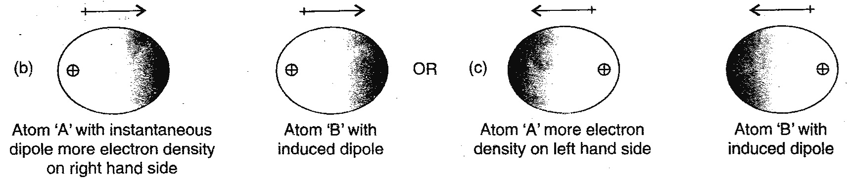 Suppose we have two atoms of neon ‘A’ and ‘B’ in the close vicinity of each other. Rapid movement of electrons in A may cause momentary accumulation of electron density on one side thus causing the charge distribution to become unsymmetrical. In other word, the charge cloud is more concentrated on one side than the other. This will result in the development of temporary instantaneous dipole on the atom ‘A’ for a very short time. This instantaneous dipole distorts the electron density of the atom ‘B’, which is close to it. In other words, a dipole is induced in the atom ‘B’ also.