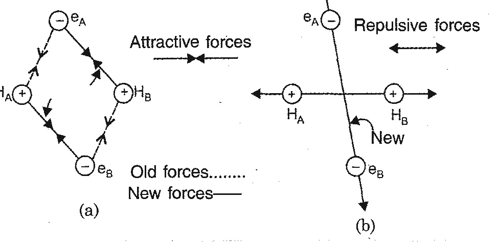 i) Attractive forces operate between electron of atom A (eA) and nucleus of B (HB) and electron of atom B (eB) and nucleus of A (HA). These two new attractive forces are shown in Fig. (a)