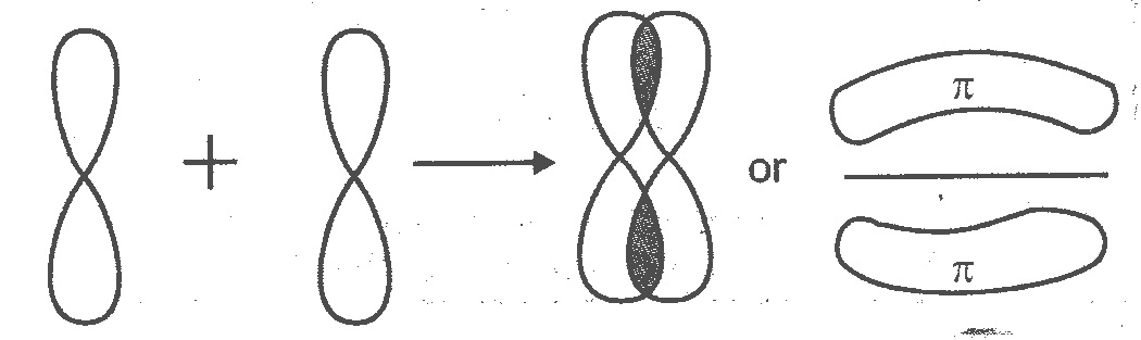 Pi (π) bond: – This type of covalent bond is formed by the sidewise overlap of the half-filled atomic orbitals of bonding atoms. Such an overlap is known as sidewise or lateral overlap. The atomic orbitals overlap in such a way that their axes remain parallel to each other and perpendicular to the internuclear axis. The orbital obtained as a result of sidewise overlap consists of two saucer type charged clouds above and below the plane of the participating atoms.